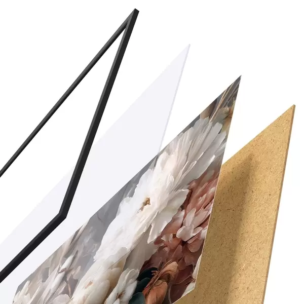 De poster bestaat uit een frame, plexiglas, geprinte afbeelding en spaanplaat achterkant. De poster kan meteen aan de muur worden gehangen dankzij de bevestigingen op de achterkant.