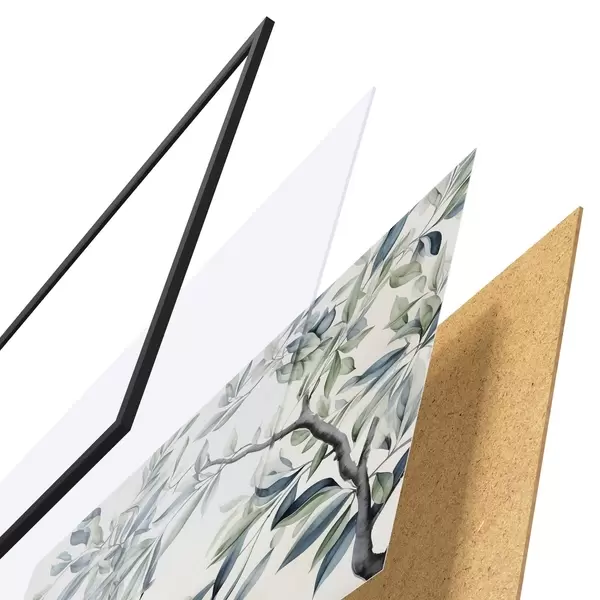 De poster bestaat uit een frame, plexiglas, geprinte afbeelding en spaanplaat achterkant. De poster kan meteen aan de muur worden gehangen dankzij de bevestigingen op de achterkant.