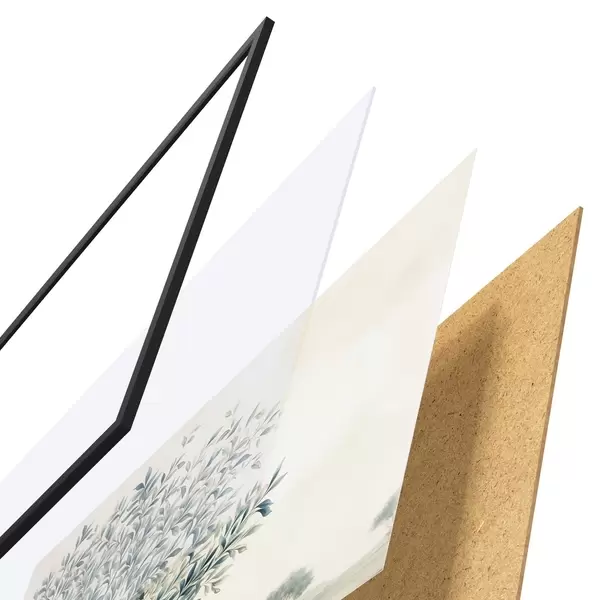 De poster bestaat uit een frame, plexiglas, geprinte afbeelding en spaanplaat achterkant. De poster kan meteen aan de muur worden gehangen dankzij de bevestigingen op de achterkant.