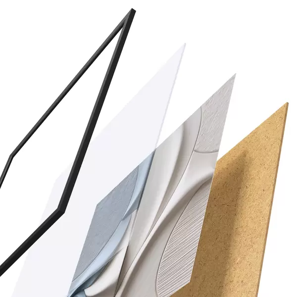 De poster bestaat uit een frame, plexiglas, geprinte afbeelding en spaanplaat achterkant. De poster kan meteen aan de muur worden gehangen dankzij de bevestigingen op de achterkant.