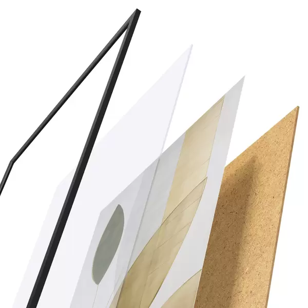 De poster bestaat uit een frame, plexiglas, geprinte afbeelding en spaanplaat achterkant. De poster kan meteen aan de muur worden gehangen dankzij de bevestigingen op de achterkant.