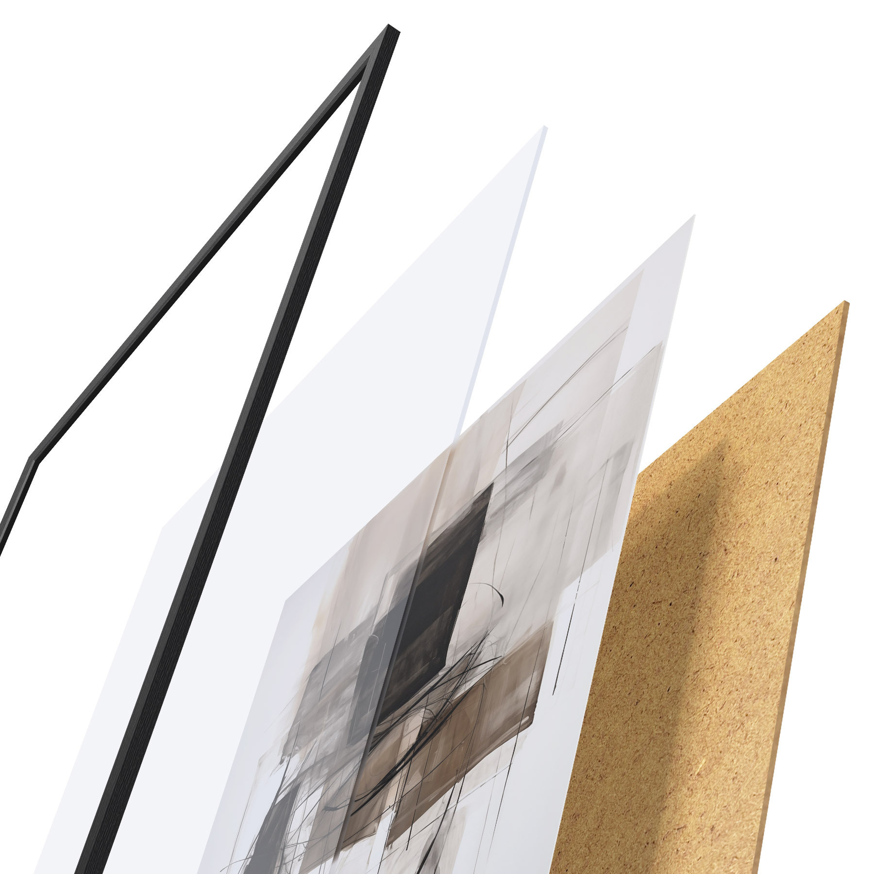De poster bestaat uit een frame, plexiglas, geprinte afbeelding en spaanplaat achterkant. De poster kan meteen aan de muur worden gehangen dankzij de bevestigingen op de achterkant.