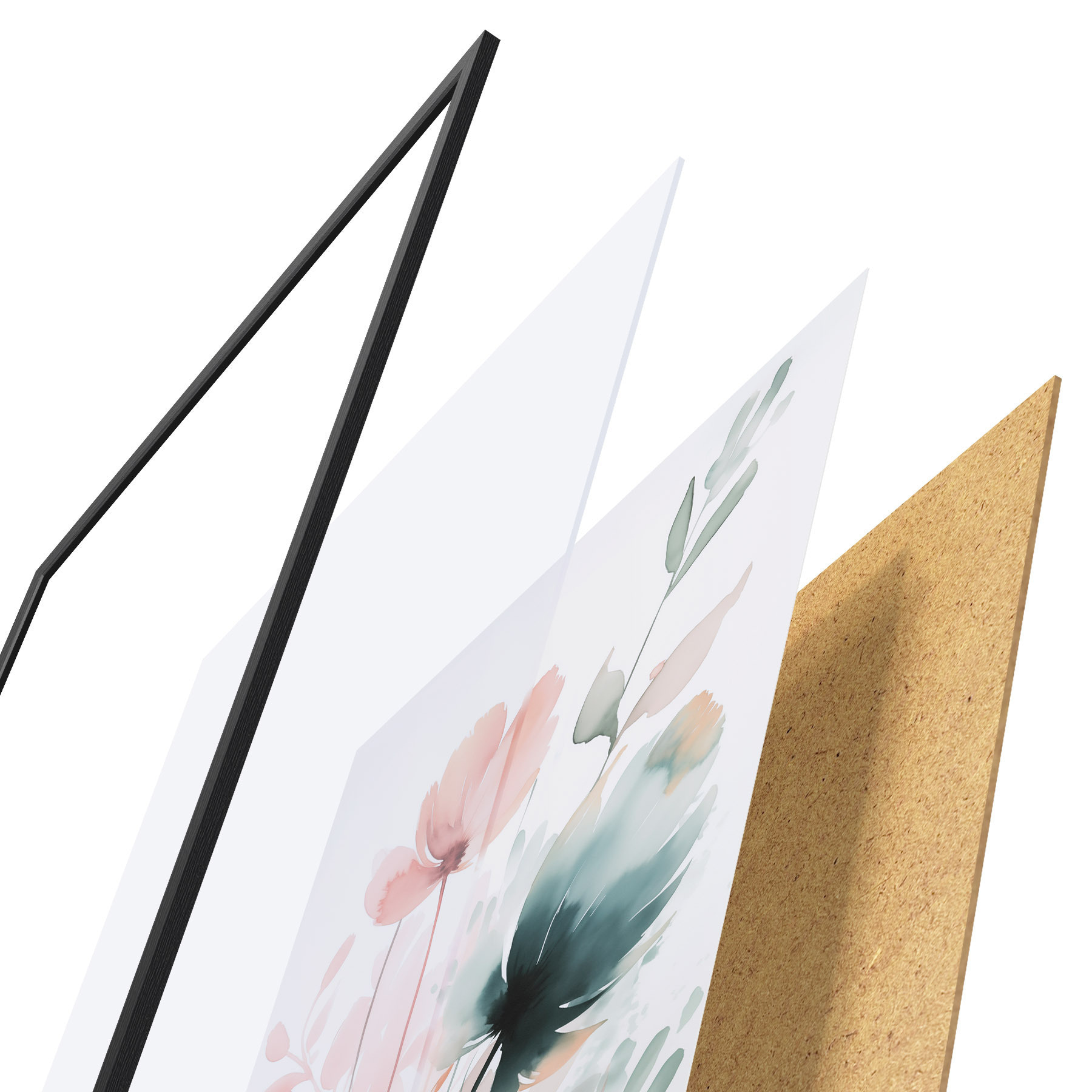 De poster bestaat uit een frame, plexiglas, geprinte afbeelding en spaanplaat achterkant. De poster kan meteen aan de muur worden gehangen dankzij de bevestigingen op de achterkant.