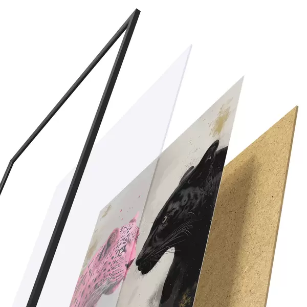 De poster bestaat uit een frame, plexiglas, geprinte afbeelding en spaanplaat achterkant. De poster kan meteen aan de muur worden gehangen dankzij de bevestigingen op de achterkant.