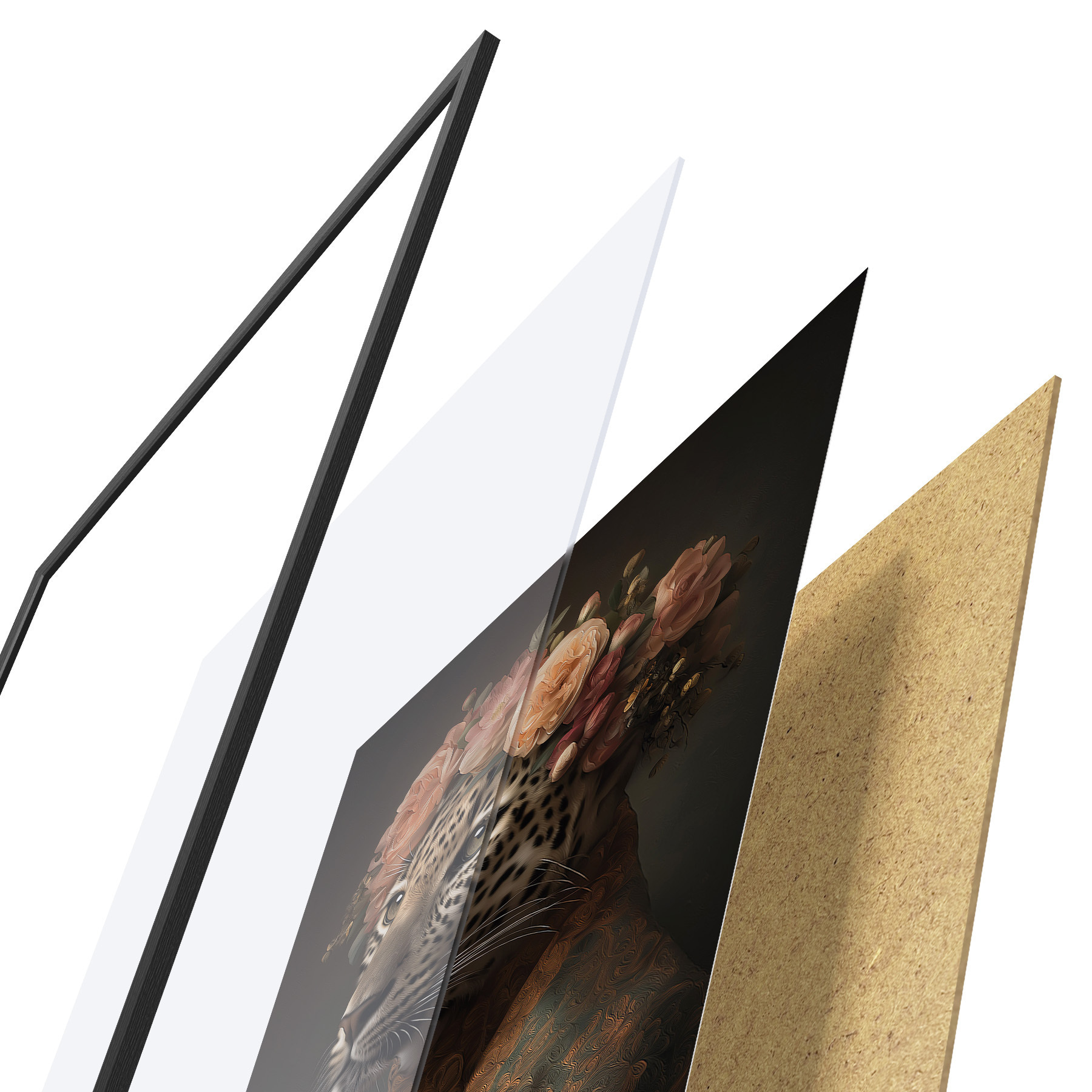 De poster bestaat uit een frame, plexiglas, geprinte afbeelding en spaanplaat achterkant. De poster kan meteen aan de muur worden gehangen dankzij de bevestigingen op de achterkant.