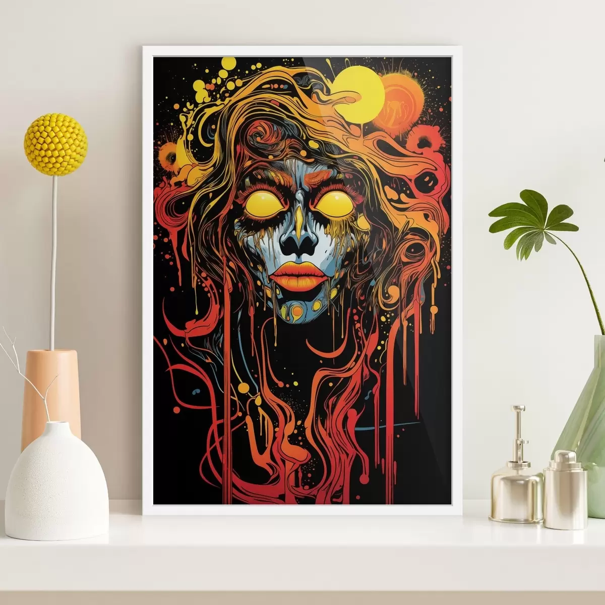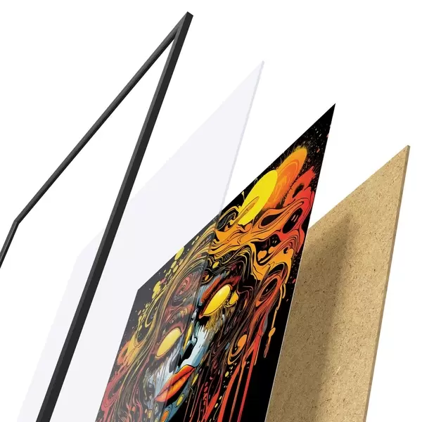 De poster bestaat uit een frame, plexiglas, geprinte afbeelding en spaanplaat achterkant. De poster kan meteen aan de muur worden gehangen dankzij de bevestigingen op de achterkant.