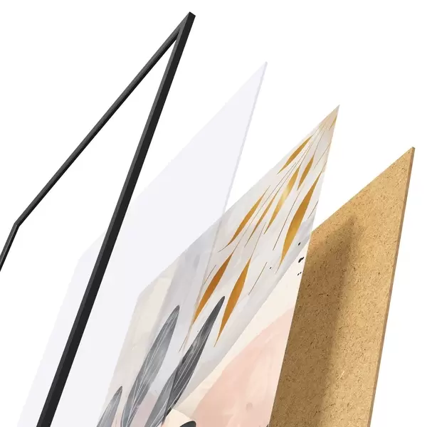 De poster bestaat uit een frame, plexiglas, geprinte afbeelding en spaanplaat achterkant. De poster kan meteen aan de muur worden gehangen dankzij de bevestigingen op de achterkant.