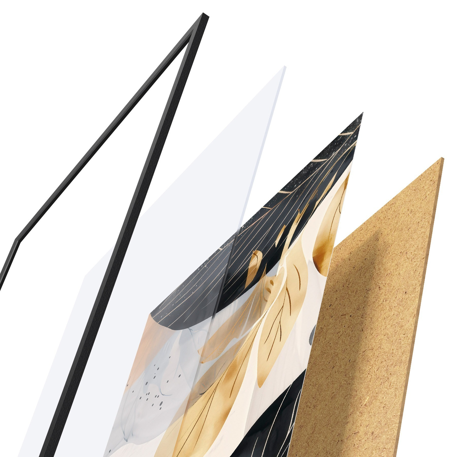 De poster bestaat uit een frame, plexiglas, geprinte afbeelding en spaanplaat achterkant. De poster kan meteen aan de muur worden gehangen dankzij de bevestigingen op de achterkant.