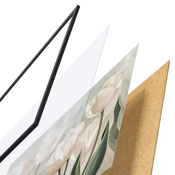 De poster bestaat uit een frame, plexiglas, geprinte afbeelding en spaanplaat achterkant. De poster kan meteen aan de muur worden gehangen dankzij de bevestigingen op de achterkant.