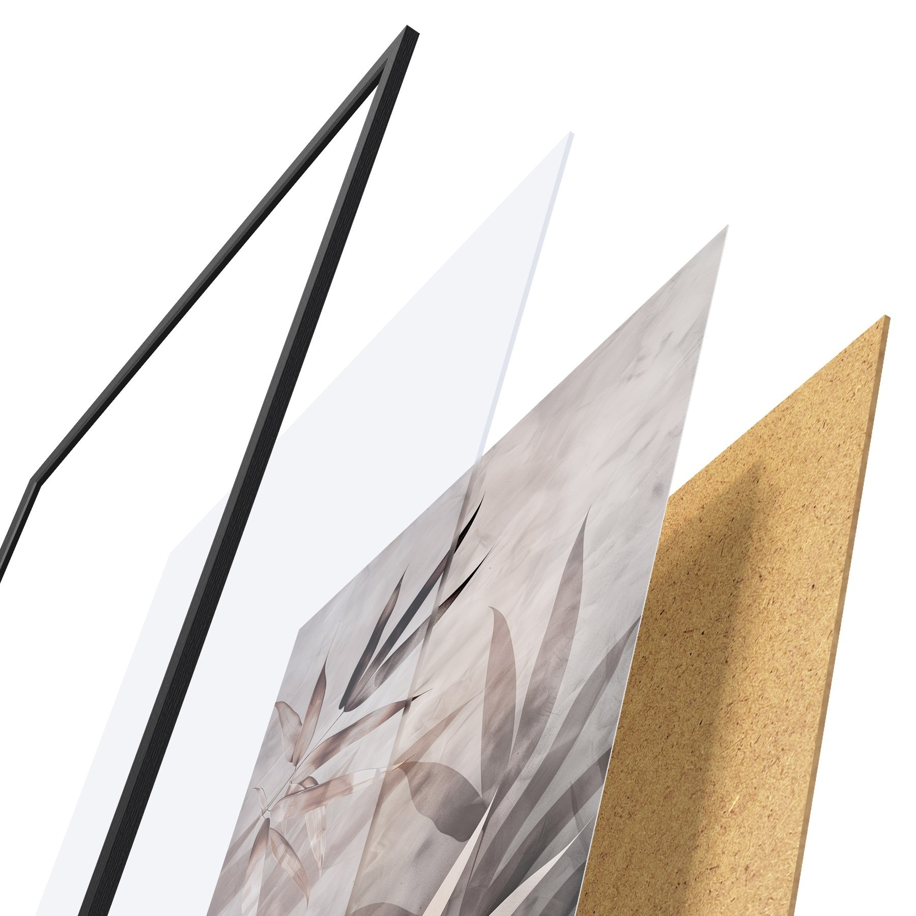 De poster bestaat uit een frame, plexiglas, geprinte afbeelding en spaanplaat achterkant. De poster kan meteen aan de muur worden gehangen dankzij de bevestigingen op de achterkant.