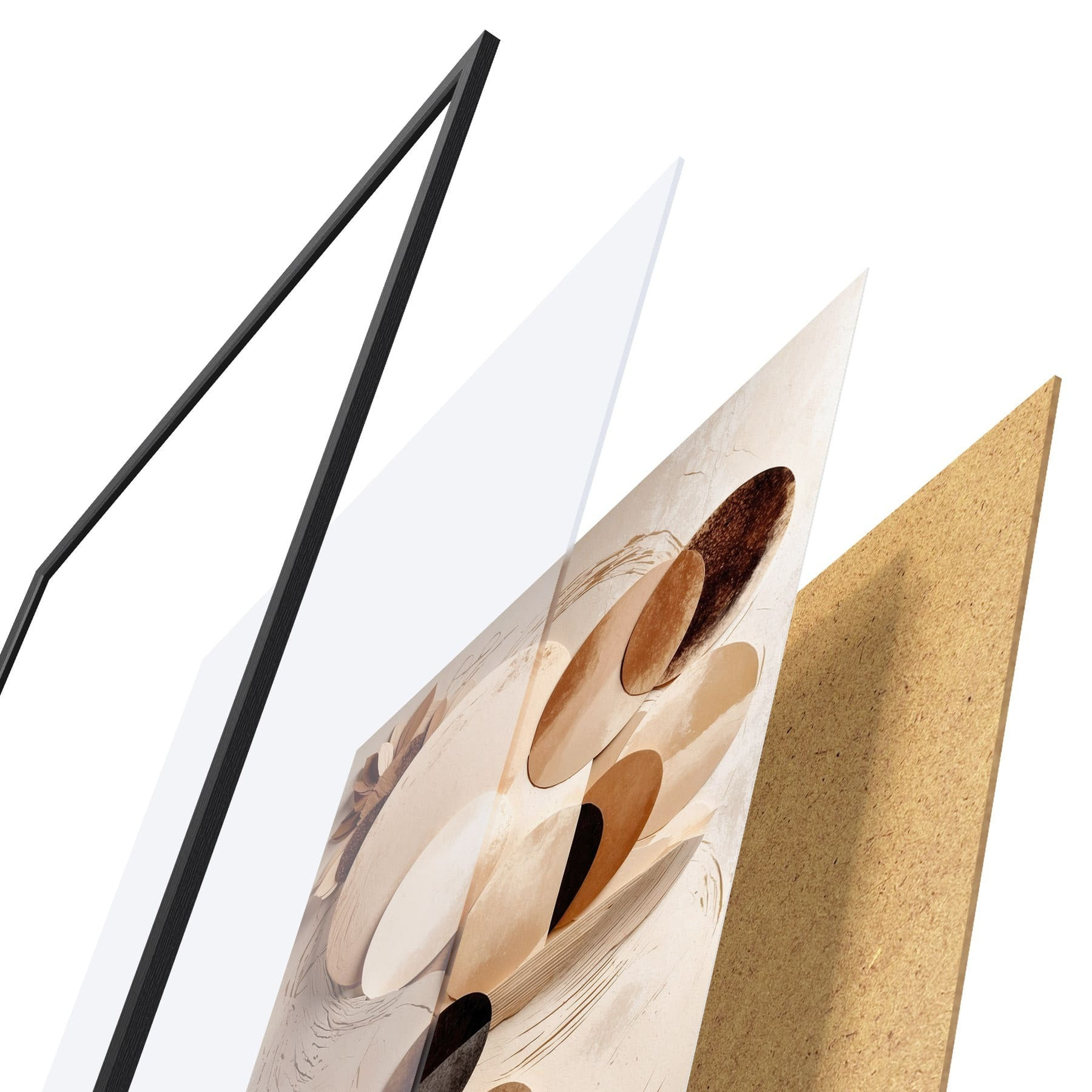 De poster bestaat uit een frame, plexiglas, geprinte afbeelding en spaanplaat achterkant. De poster kan meteen aan de muur worden gehangen dankzij de bevestigingen op de achterkant.