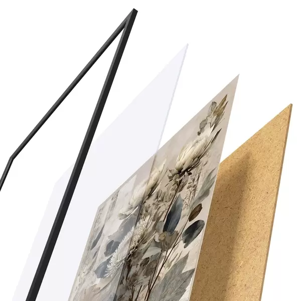 De poster bestaat uit een frame, plexiglas, geprinte afbeelding en spaanplaat achterkant. De poster kan meteen aan de muur worden gehangen dankzij de bevestigingen op de achterkant.