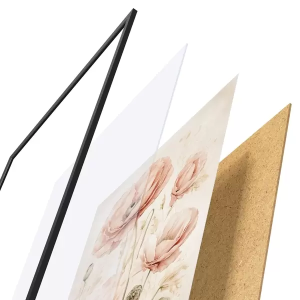 De poster bestaat uit een frame, plexiglas, geprinte afbeelding en spaanplaat achterkant. De poster kan meteen aan de muur worden gehangen dankzij de bevestigingen op de achterkant.