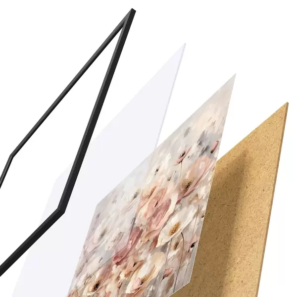 De poster bestaat uit een frame, plexiglas, geprinte afbeelding en spaanplaat achterkant. De poster kan meteen aan de muur worden gehangen dankzij de bevestigingen op de achterkant.