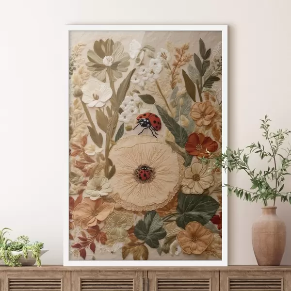 Poster Twee lieveheersbeestjes tussen zachte bloemen N° f47758