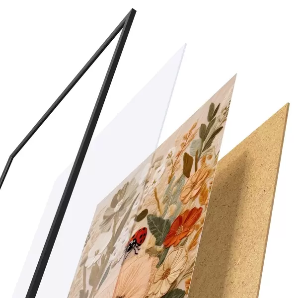 De poster bestaat uit een frame, plexiglas, geprinte afbeelding en spaanplaat achterkant. De poster kan meteen aan de muur worden gehangen dankzij de bevestigingen op de achterkant.