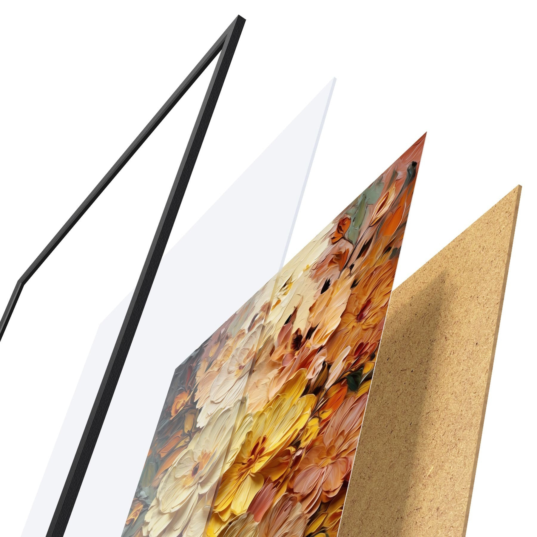 De poster bestaat uit een frame, plexiglas, geprinte afbeelding en spaanplaat achterkant. De poster kan meteen aan de muur worden gehangen dankzij de bevestigingen op de achterkant.