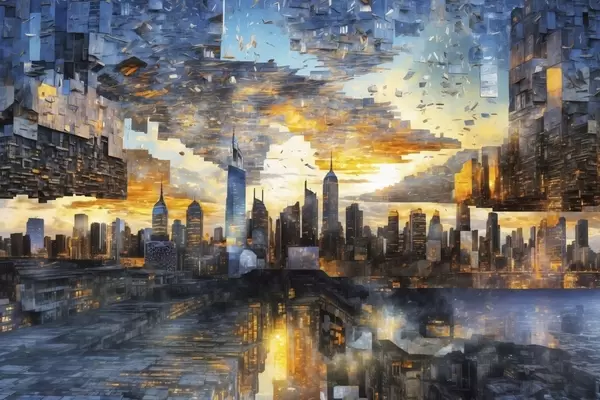 Poster Fantastisch stadsgezicht met een gefragmenteerde lucht N° f47768