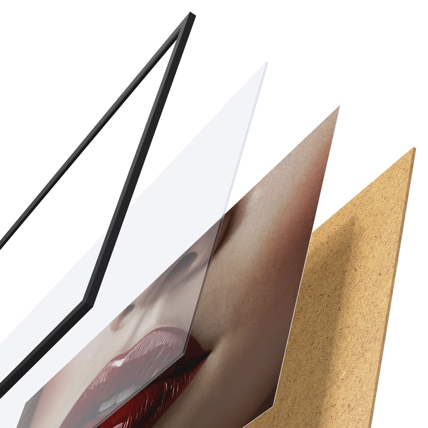 De poster bestaat uit een frame, plexiglas, geprinte afbeelding en spaanplaat achterkant. De poster kan meteen aan de muur worden gehangen dankzij de bevestigingen op de achterkant.