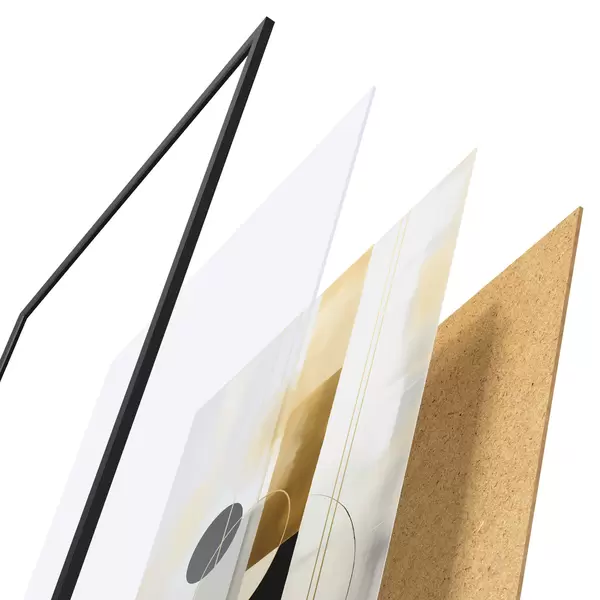 De poster bestaat uit een frame, plexiglas, geprinte afbeelding en spaanplaat achterkant. De poster kan meteen aan de muur worden gehangen dankzij de bevestigingen op de achterkant.