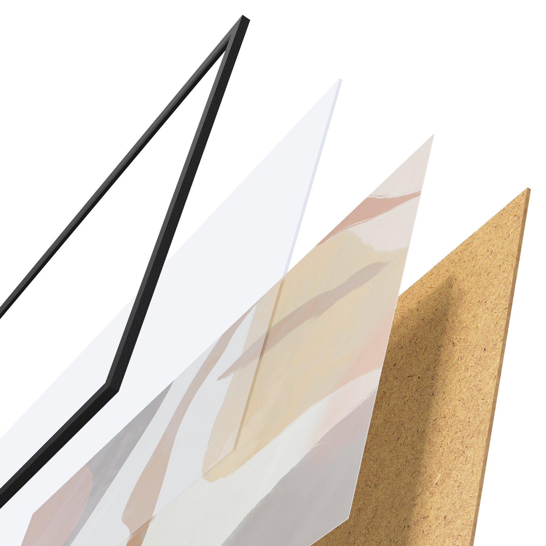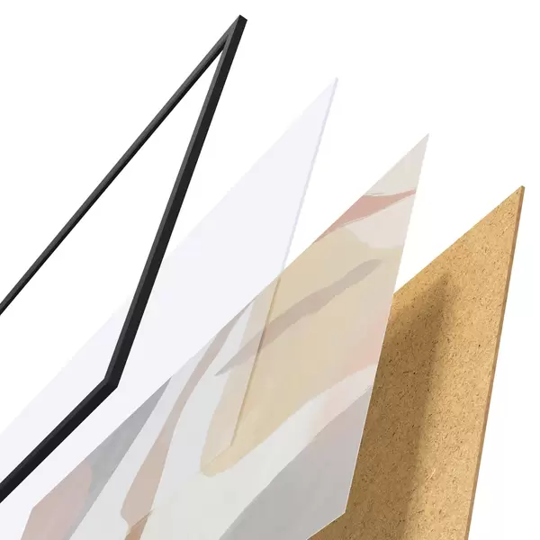De poster bestaat uit een frame, plexiglas, geprinte afbeelding en spaanplaat achterkant. De poster kan meteen aan de muur worden gehangen dankzij de bevestigingen op de achterkant.
