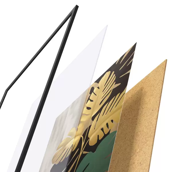 De poster bestaat uit een frame, plexiglas, geprinte afbeelding en spaanplaat achterkant. De poster kan meteen aan de muur worden gehangen dankzij de bevestigingen op de achterkant.