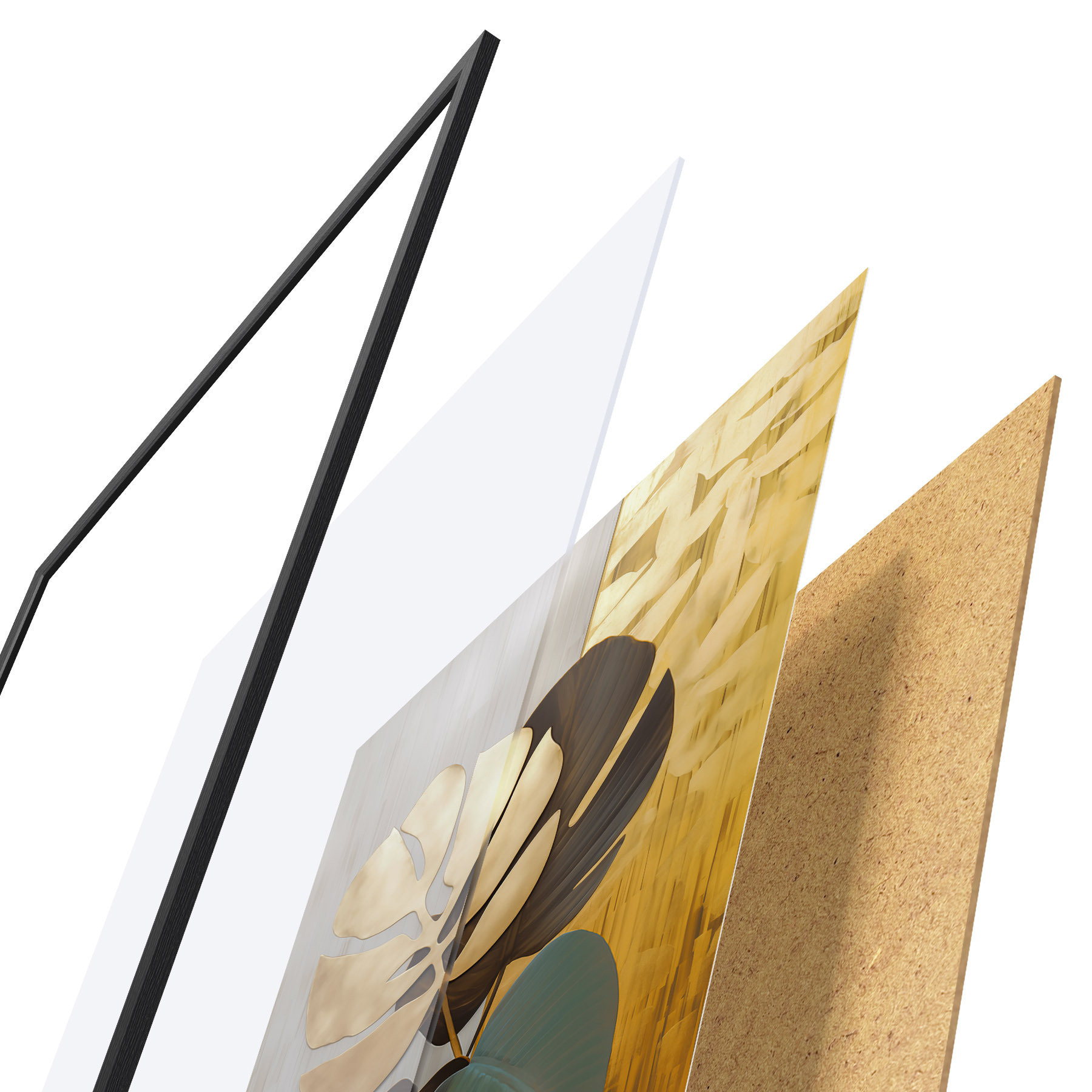 De poster bestaat uit een frame, plexiglas, geprinte afbeelding en spaanplaat achterkant. De poster kan meteen aan de muur worden gehangen dankzij de bevestigingen op de achterkant.