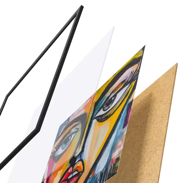 De poster bestaat uit een frame, plexiglas, geprinte afbeelding en spaanplaat achterkant. De poster kan meteen aan de muur worden gehangen dankzij de bevestigingen op de achterkant.