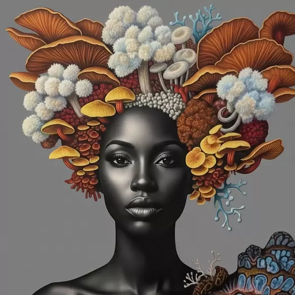 Poster Portret van een vrouw met paddenstoelen f47788