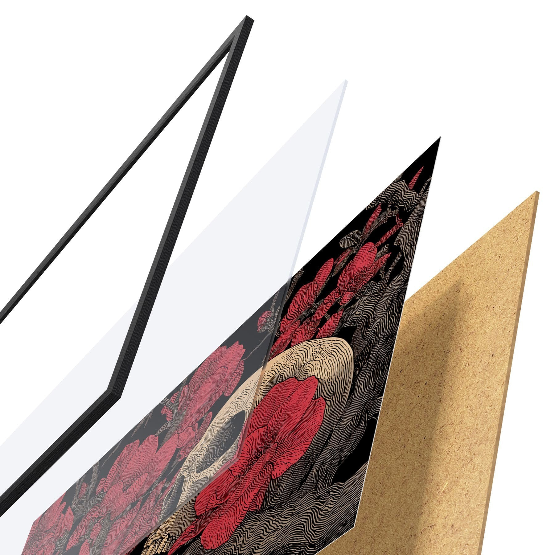 De poster bestaat uit een frame, plexiglas, geprinte afbeelding en spaanplaat achterkant. De poster kan meteen aan de muur worden gehangen dankzij de bevestigingen op de achterkant.
