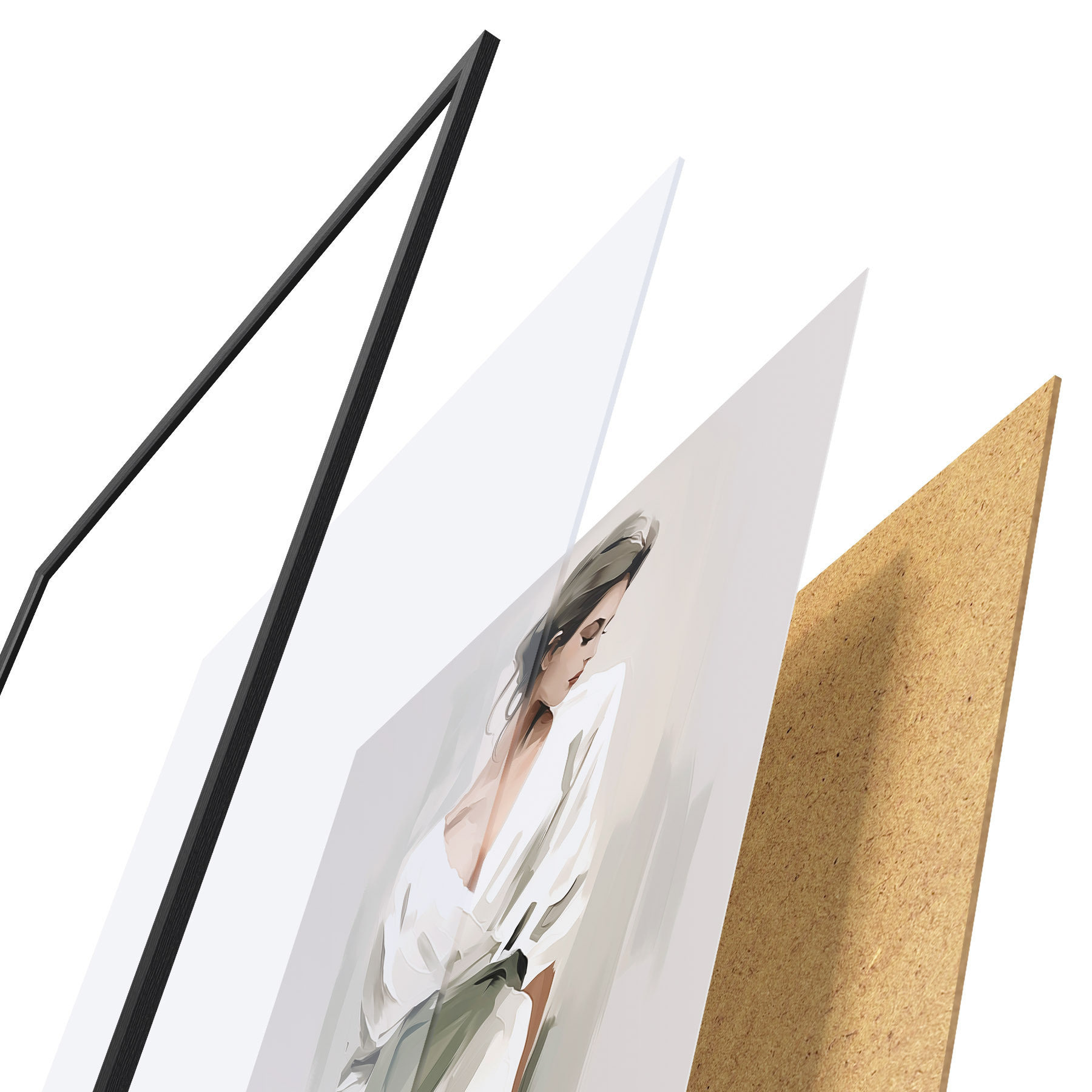 De poster bestaat uit een frame, plexiglas, geprinte afbeelding en spaanplaat achterkant. De poster kan meteen aan de muur worden gehangen dankzij de bevestigingen op de achterkant.