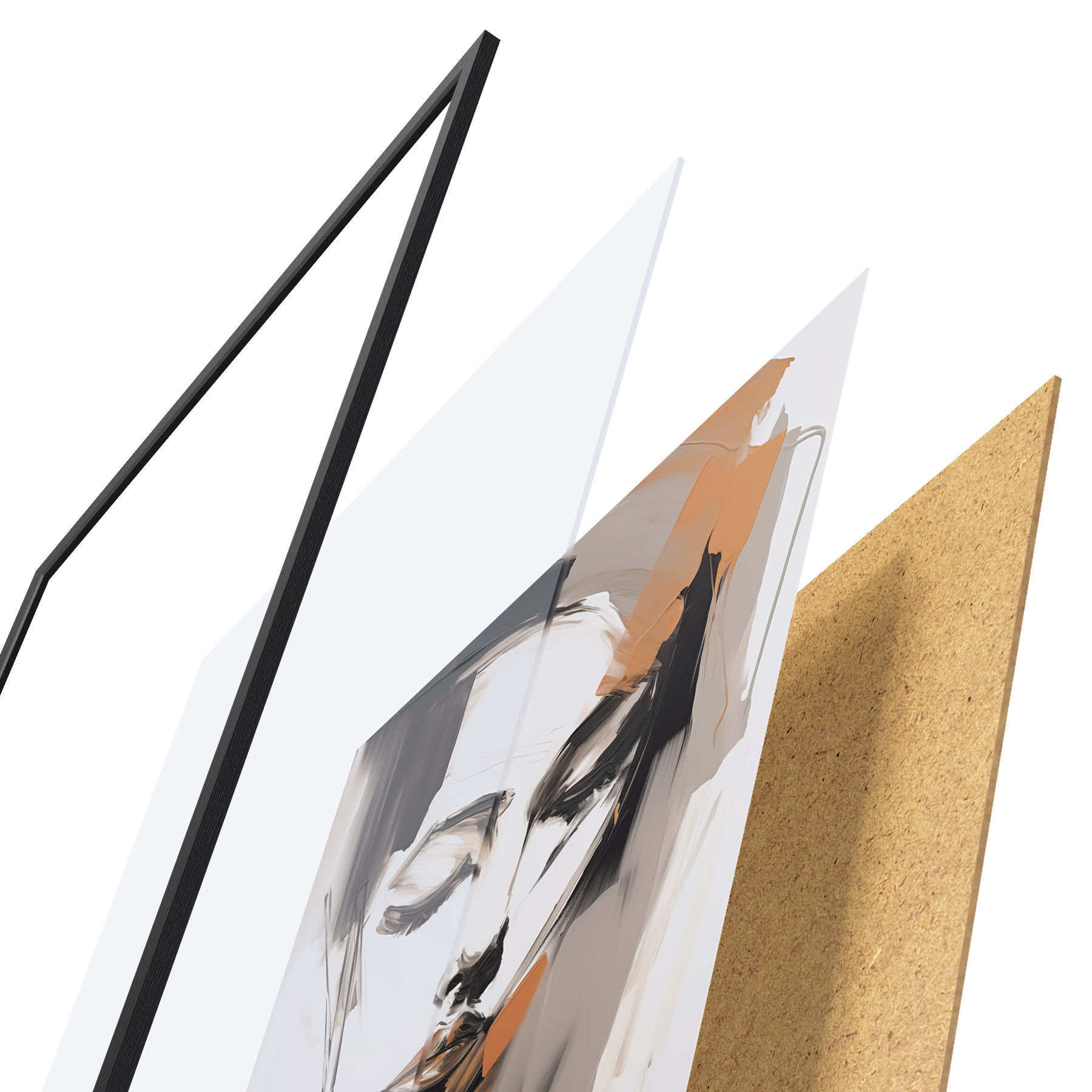 De poster bestaat uit een frame, plexiglas, geprinte afbeelding en spaanplaat achterkant. De poster kan meteen aan de muur worden gehangen dankzij de bevestigingen op de achterkant.