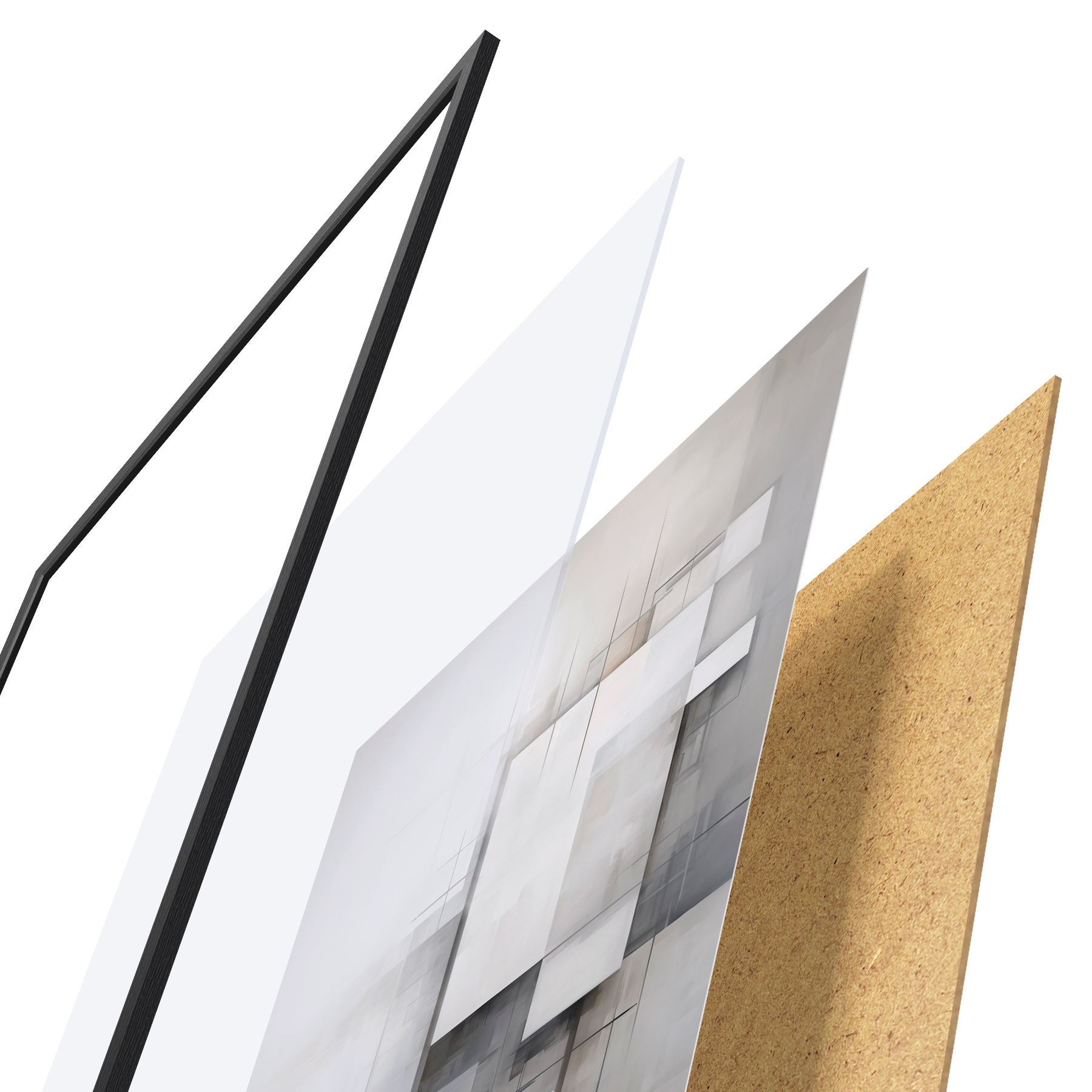 De poster bestaat uit een frame, plexiglas, geprinte afbeelding en spaanplaat achterkant. De poster kan meteen aan de muur worden gehangen dankzij de bevestigingen op de achterkant.