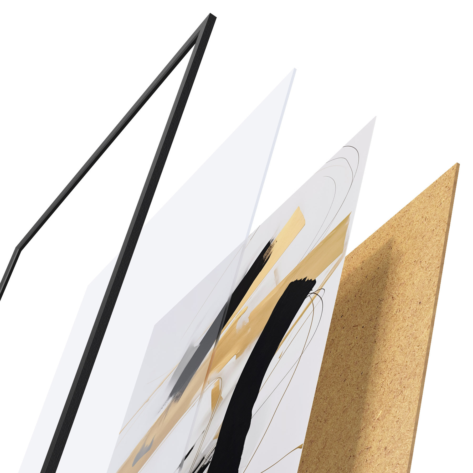 De poster bestaat uit een frame, plexiglas, geprinte afbeelding en spaanplaat achterkant. De poster kan meteen aan de muur worden gehangen dankzij de bevestigingen op de achterkant.