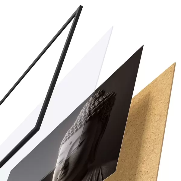 De poster bestaat uit een frame, plexiglas, geprinte afbeelding en spaanplaat achterkant. De poster kan meteen aan de muur worden gehangen dankzij de bevestigingen op de achterkant.