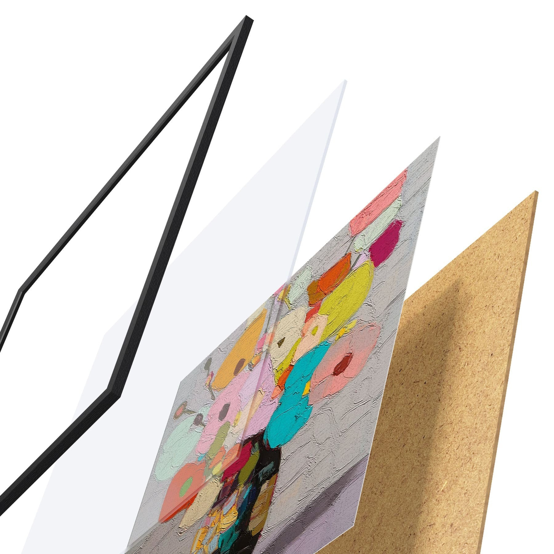 De poster bestaat uit een frame, plexiglas, geprinte afbeelding en spaanplaat achterkant. De poster kan meteen aan de muur worden gehangen dankzij de bevestigingen op de achterkant.