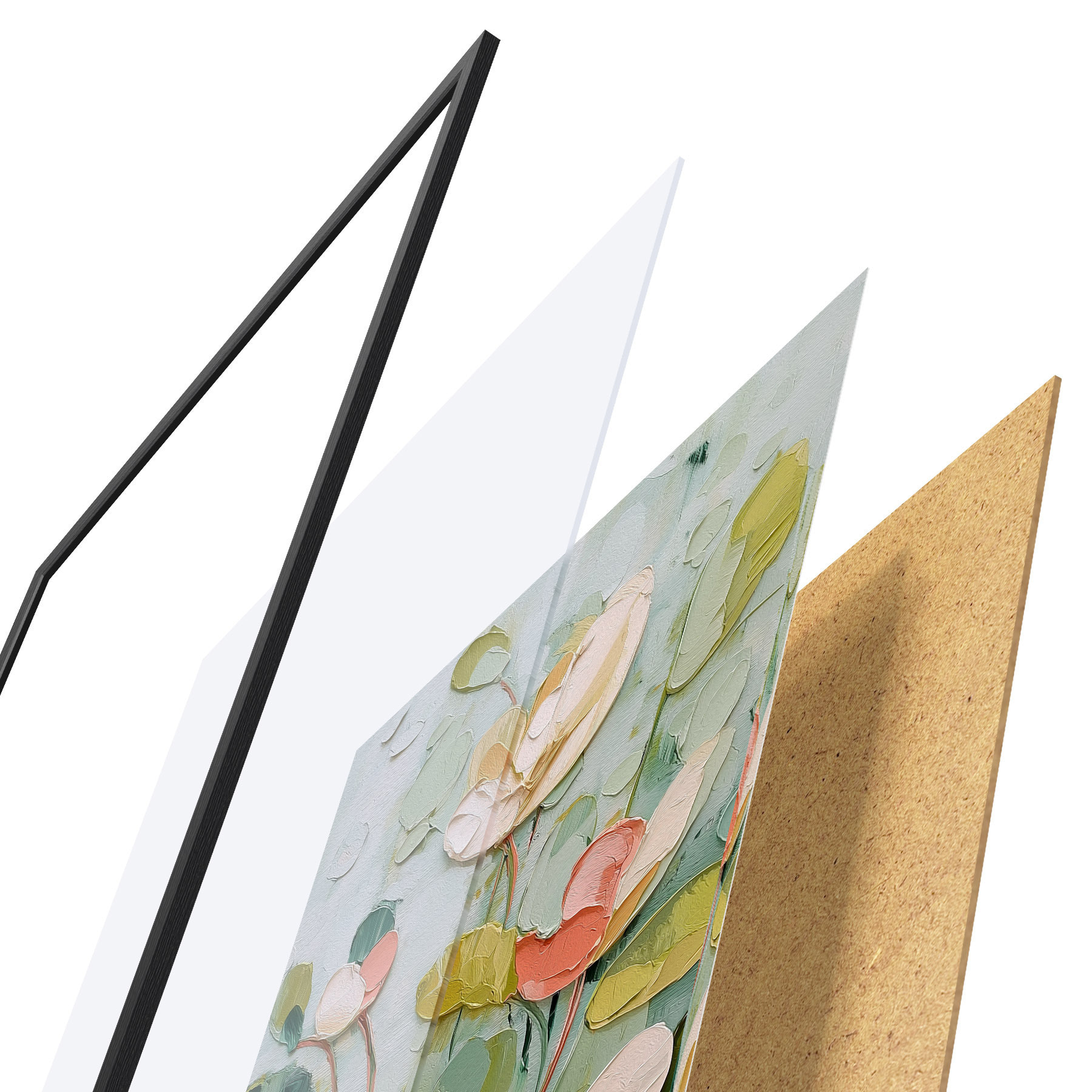 De poster bestaat uit een frame, plexiglas, geprinte afbeelding en spaanplaat achterkant. De poster kan meteen aan de muur worden gehangen dankzij de bevestigingen op de achterkant.