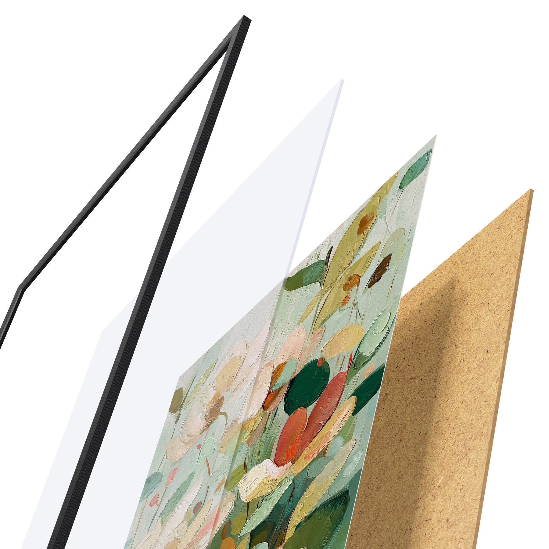 De poster bestaat uit een frame, plexiglas, geprinte afbeelding en spaanplaat achterkant. De poster kan meteen aan de muur worden gehangen dankzij de bevestigingen op de achterkant.