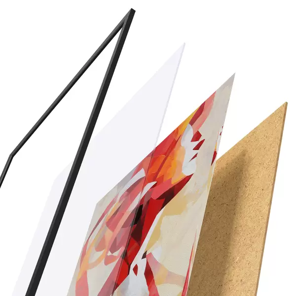 De poster bestaat uit een frame, plexiglas, geprinte afbeelding en spaanplaat achterkant. De poster kan meteen aan de muur worden gehangen dankzij de bevestigingen op de achterkant.