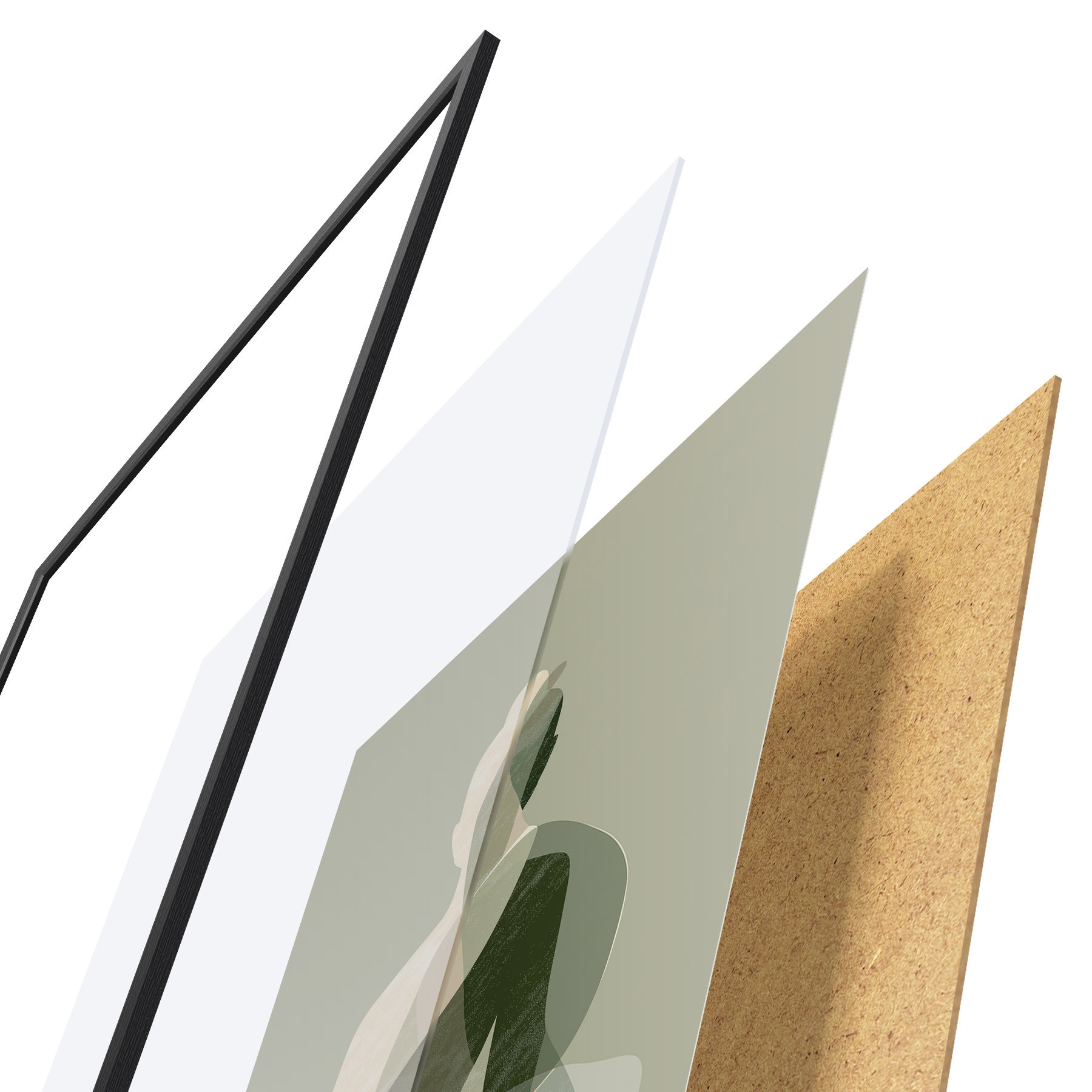 De poster bestaat uit een frame, plexiglas, geprinte afbeelding en spaanplaat achterkant. De poster kan meteen aan de muur worden gehangen dankzij de bevestigingen op de achterkant.