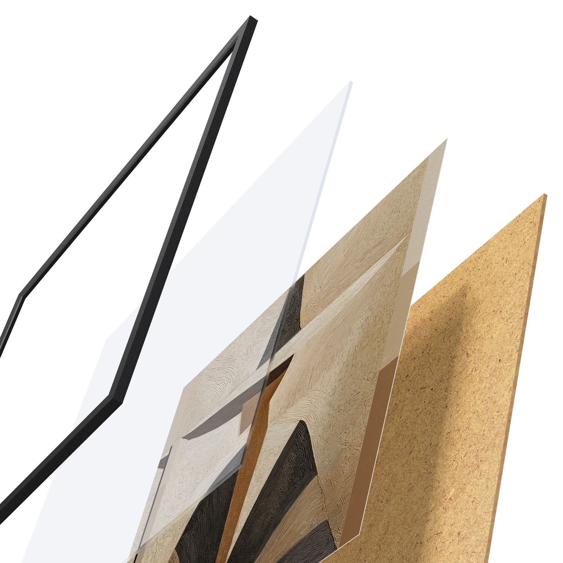 De poster bestaat uit een frame, plexiglas, geprinte afbeelding en spaanplaat achterkant. De poster kan meteen aan de muur worden gehangen dankzij de bevestigingen op de achterkant.