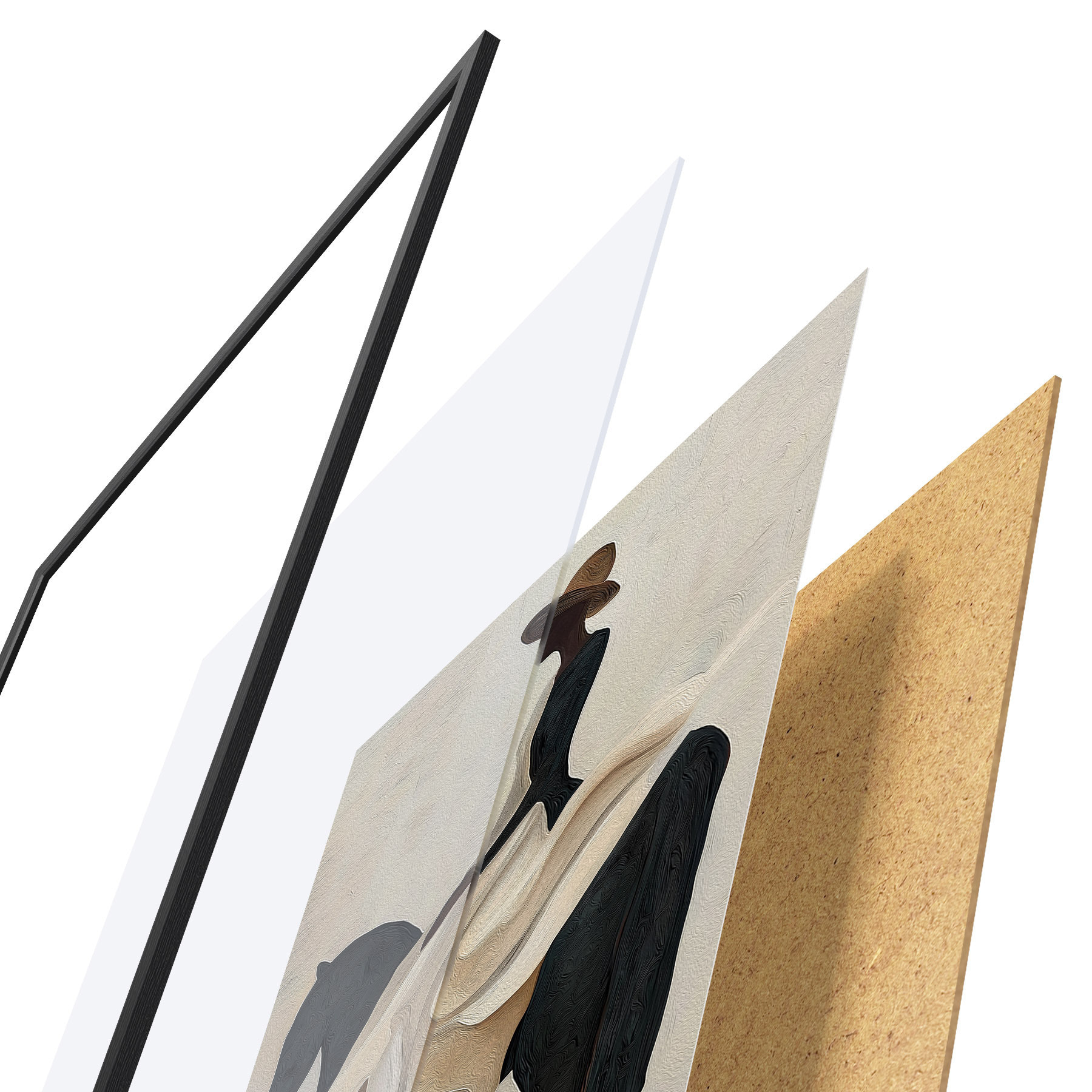 De poster bestaat uit een frame, plexiglas, geprinte afbeelding en spaanplaat achterkant. De poster kan meteen aan de muur worden gehangen dankzij de bevestigingen op de achterkant.