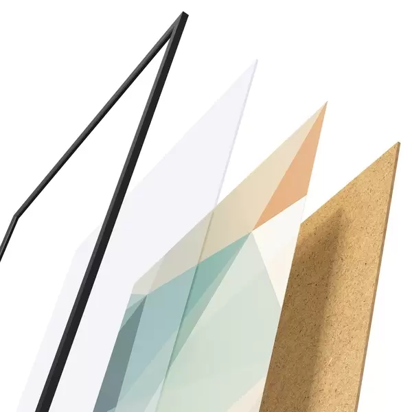 De poster bestaat uit een frame, plexiglas, geprinte afbeelding en spaanplaat achterkant. De poster kan meteen aan de muur worden gehangen dankzij de bevestigingen op de achterkant.