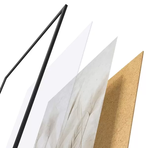 De poster bestaat uit een frame, plexiglas, geprinte afbeelding en spaanplaat achterkant. De poster kan meteen aan de muur worden gehangen dankzij de bevestigingen op de achterkant.