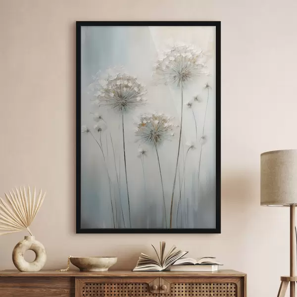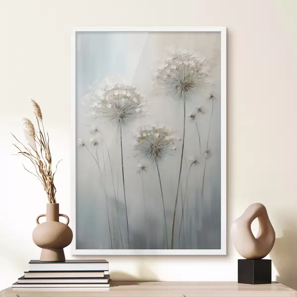 Poster Textuurrijke schilderstijl van paardenbloemen tegen een zachte blauw-witte achtergrond f47855