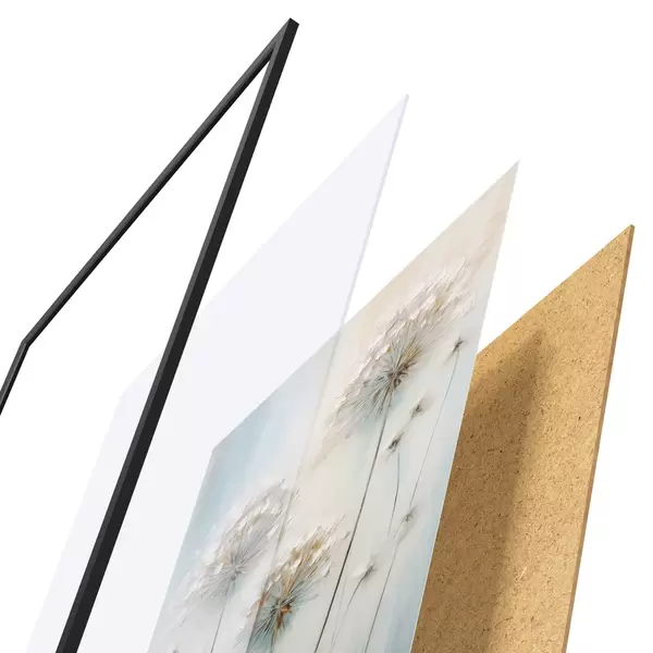De poster bestaat uit een frame, plexiglas, geprinte afbeelding en spaanplaat achterkant. De poster kan meteen aan de muur worden gehangen dankzij de bevestigingen op de achterkant.