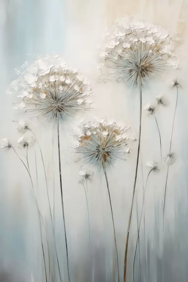 Poster Textuurrijke schilderstijl van paardenbloemen tegen een zachte blauw-witte achtergrond N° f47855