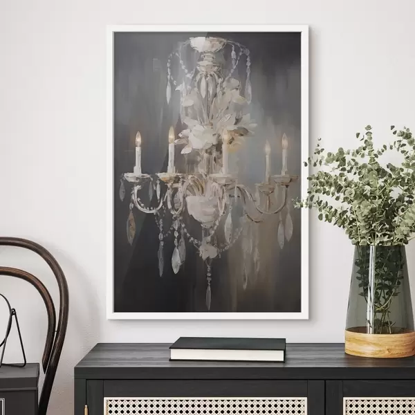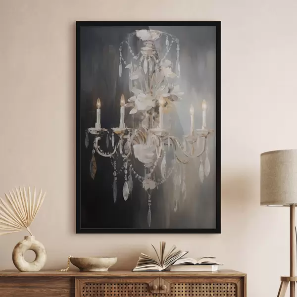 Poster Abstracte sierlijke kroonluchter met brandende kaarsen en bloemenaccenten, tegen een donkere, gestructureerde achtergrond f47857