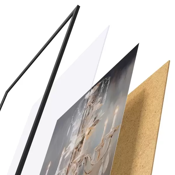 De poster bestaat uit een frame, plexiglas, geprinte afbeelding en spaanplaat achterkant. De poster kan meteen aan de muur worden gehangen dankzij de bevestigingen op de achterkant.