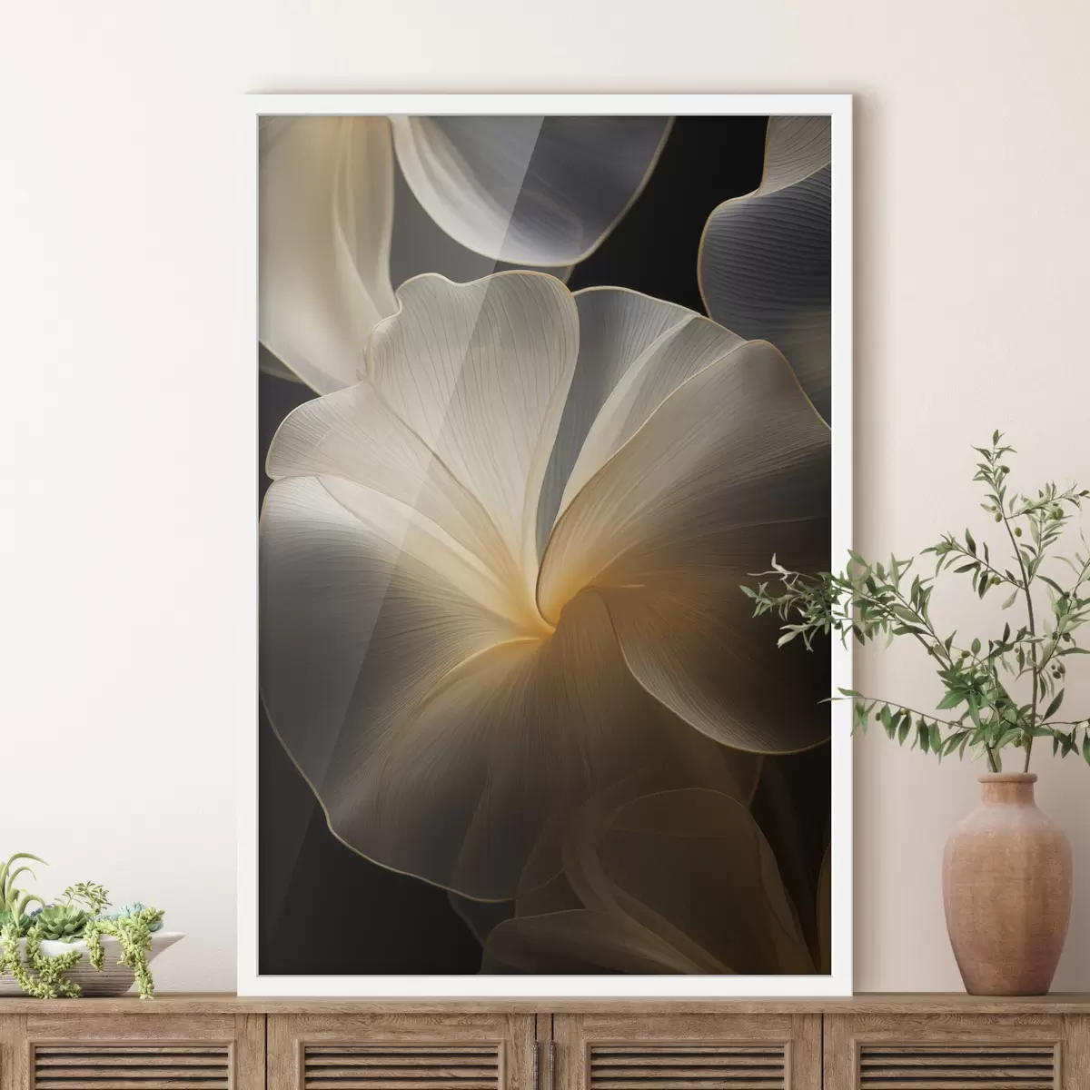 Poster Abstracte, vloeiende, doorschijnende bloemblaadjes met delicate lijnen, tegen een donkere achtergrond f47860